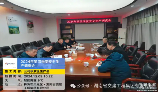 2024年12月9日,湖南省交建工程集团有限公司董事长谢志方主持召开了2024年第四季度安全生产调度会,强调安全生产是公司经营管理的重中之重,必须紧抓不懈,要求严格落实安全生产责任制,并部署安全生产具体工作。董事长提出,在岁末年初之际,各部门(分公司)更要精心组织开展安全隐患大排查大整治活动,重点检查施工现场的机械设备、临时用电、高处作业等环节,对排查出的隐患问题,及时制定整改方案,落实责任人,限期整改,确保隐患彻底消除。